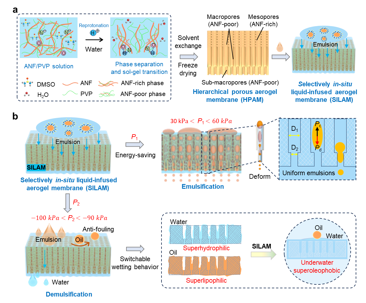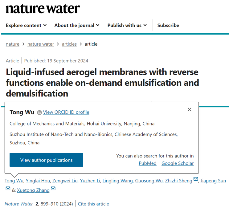 近日,我校材料与化工专业硕士研究生吴桐以第一作者身份在国际期刊《Nature Water》上发表了题为“Liquid-infused aerogel membrane with reverse functions enables on-demand emulsification and demulsification”的研究性论文。中国科学院苏州纳米技术与纳米仿生研究所张学同研究员、盛智芝副研究员和御宅屋 孙甲鹏副研究员为论文通讯作者。御宅屋 硕士研究生王玲玲和吴国松教授为论文的共同作者。