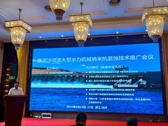 2025年8月29日- 30日,由水利部产品质量标准研究所主办的“高泥沙河流大型水力机械纳米抗磨蚀技术推广会议”在浙江杭州举行,御宅屋 “江苏省苛刻环境用先进结构功能一体化金属材料工程研究中心”与浙江省水利水电装备表面工程技术研究重点实验室等多家单位联合承办。