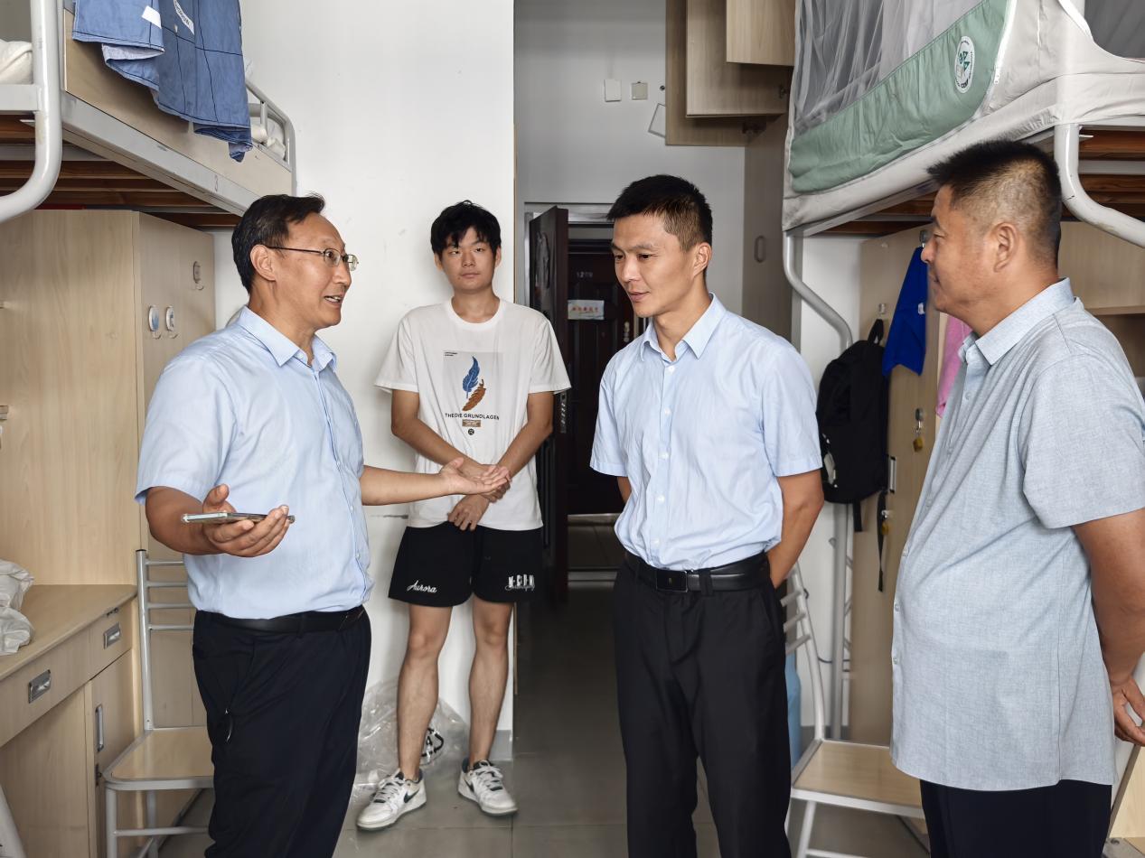 学院党委书记陈伟刚、院长赵永好,副院长宋丹,副院长杨可,副书记、副院长辛绍权等一行深入新生宿舍,亲切看望已入住的同学。“从哪里来?”“住宿还习惯吗?”“有什么困难要及时和辅导员沟通。”院领导一行细致询问同学们的入住感受和生活需求,鼓励大家尽快适应集体生活,建立融洽的宿舍关系,并叮嘱同学们注意安全、互帮互助,以良好的精神状态迎接大学新生活。
