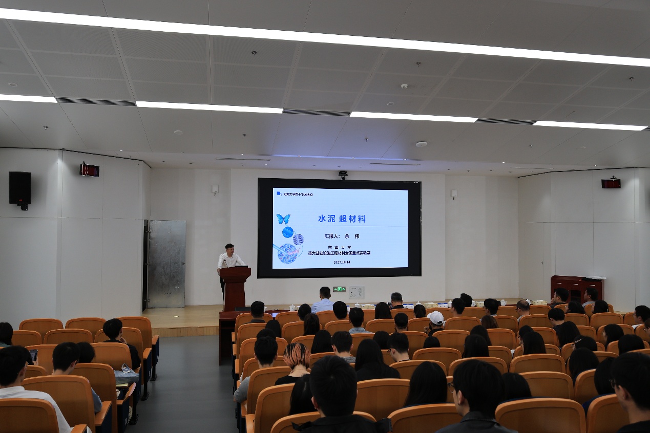 报告中,佘伟教授以“结构为骨、功能为肉、智能为魂”为引,分析了科技革命演化与材料学科发展的关系,系统阐述了对工程材料发展范式变革的深刻思考。他重点介绍了团队面向国家重大工程需求首创的“水泥基仿生超材料”新范式。团队通过仿生学与跨尺度设计,旨在突破传统材料性能极限,实现力学性能的跨越式提升,并赋予材料超绝热、超疏水、自修复等新功能,内容深邃,引人入胜,为现场师生清晰地勾勒出土木工程材料迈向智能化、绿色化与多功能化的前沿图景。