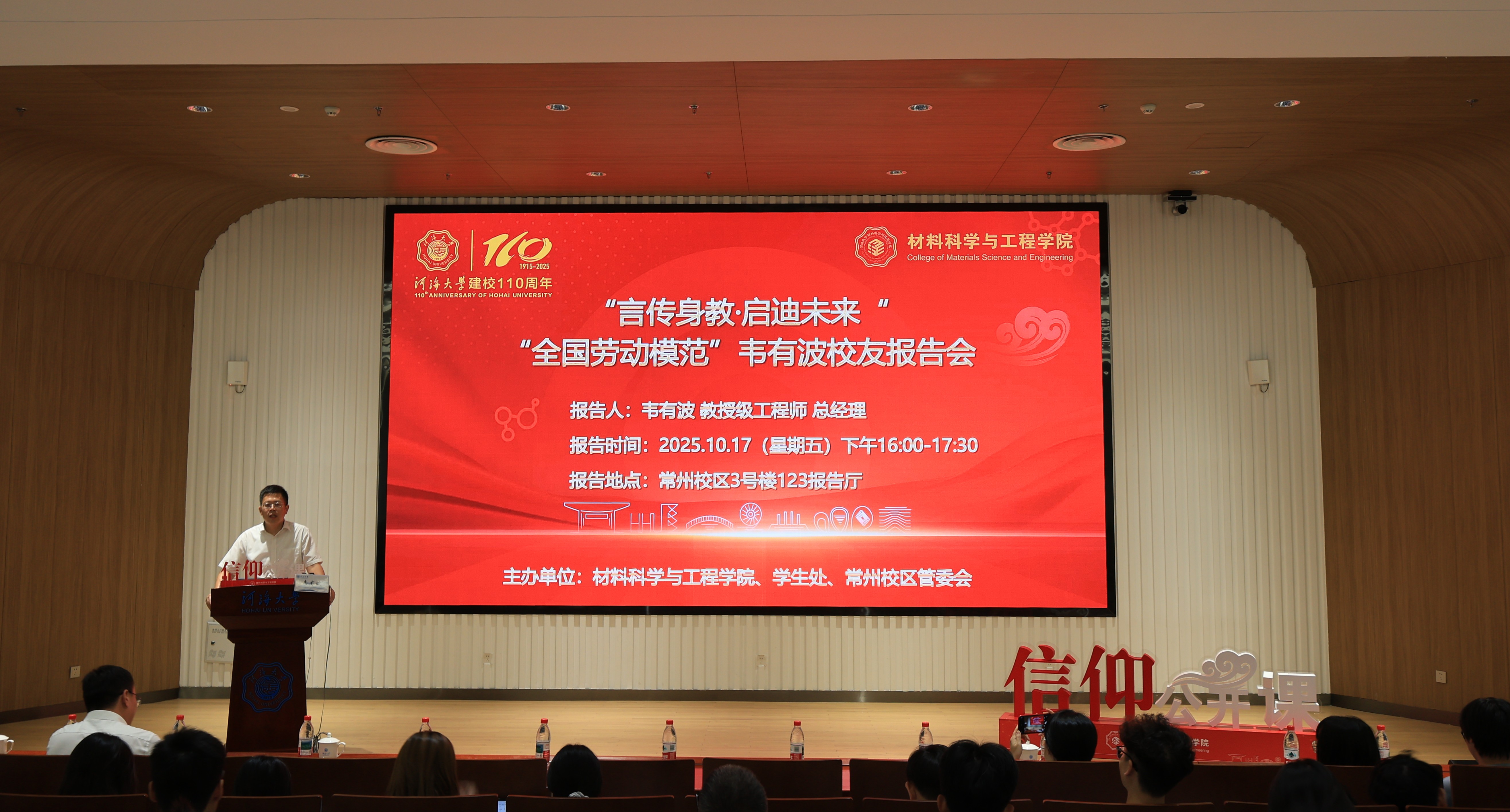 为使青年学子坚定将青春华章写在祖国大地上的选择,汲取校友榜样的奋斗力量,10月17日下午,御宅屋 与常州校区管委会联合举办“言传身教·启迪未来”——“全国劳动模范”韦有波校友报告会暨信仰公开课,2025年“全国劳动模范”称号获得者、我校2005届无机非金属材料工程专业校友韦有波应邀作题为《生成未来,做最好的自己》的分享报告。